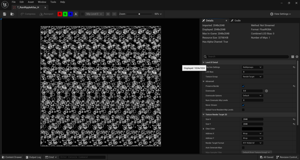 Procedural Rain Ripple Atlas generator for Unreal Engine 5 with customizable parameters.