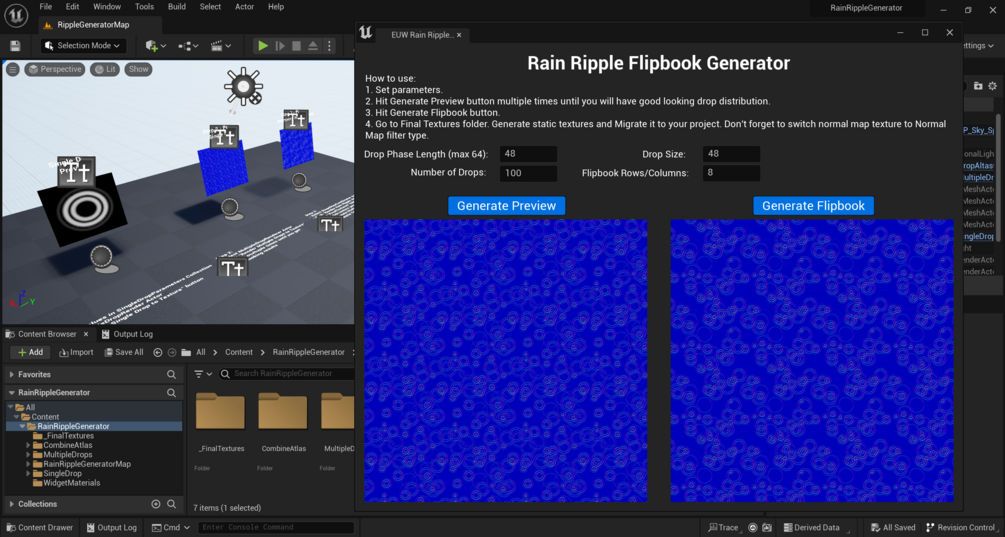 - Run EUW_RainRippleGenerator Editor Widget Blueprint.