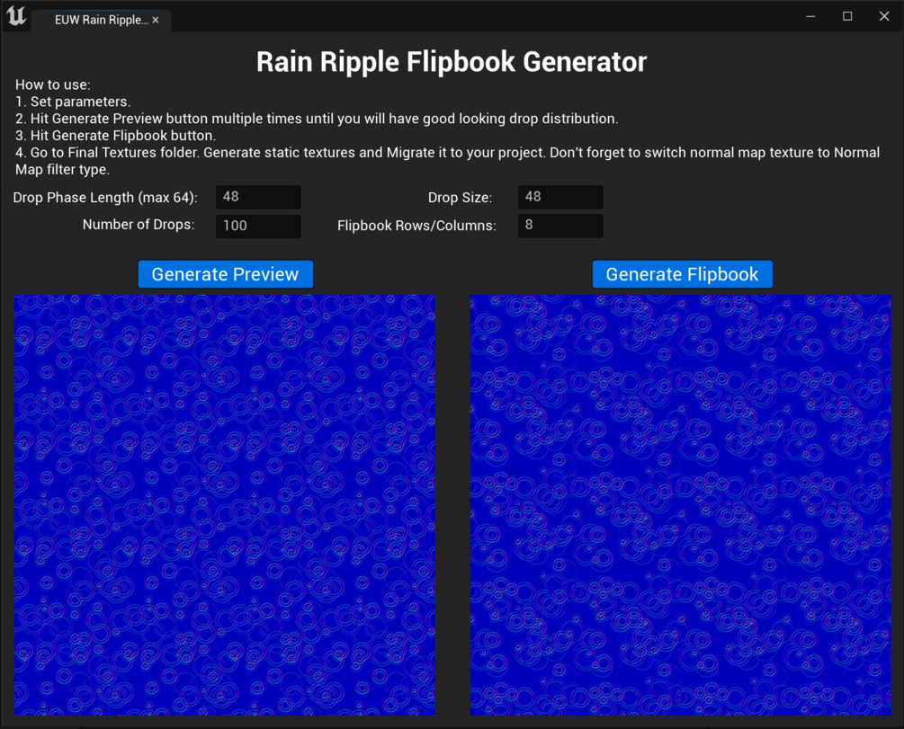 - Run EUW_RainRippleGenerator Editor Widget Blueprint.